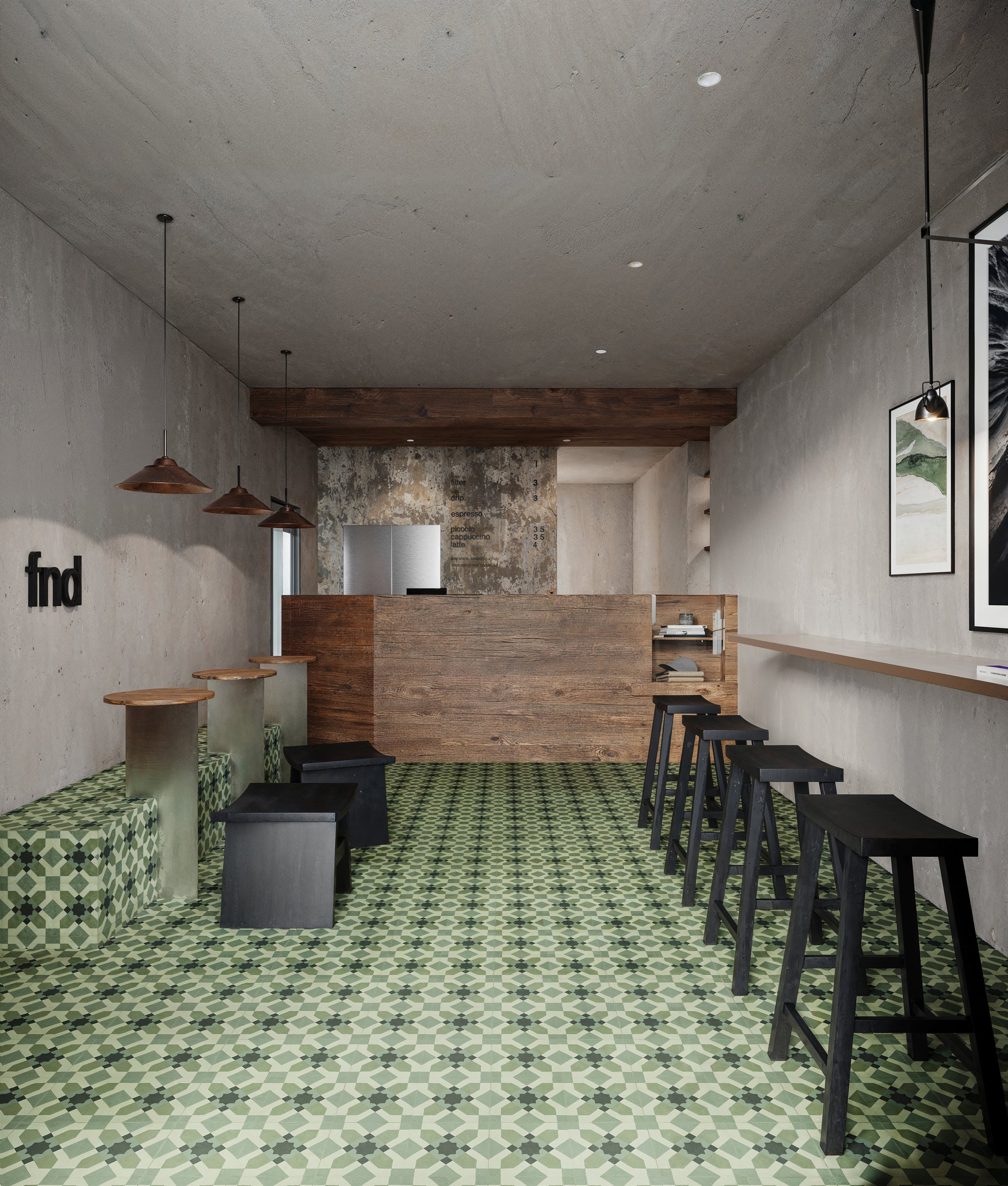 Housed within a former hardware store, the project builds a dialogue between past and present. Green floor tiles introduce freshness and depth, becoming a defining chromatic element of the interior. Light wood surfaces on the counter and shelving add warmth and a sense of natural simplicity, evoking craftsmanship and authenticity.