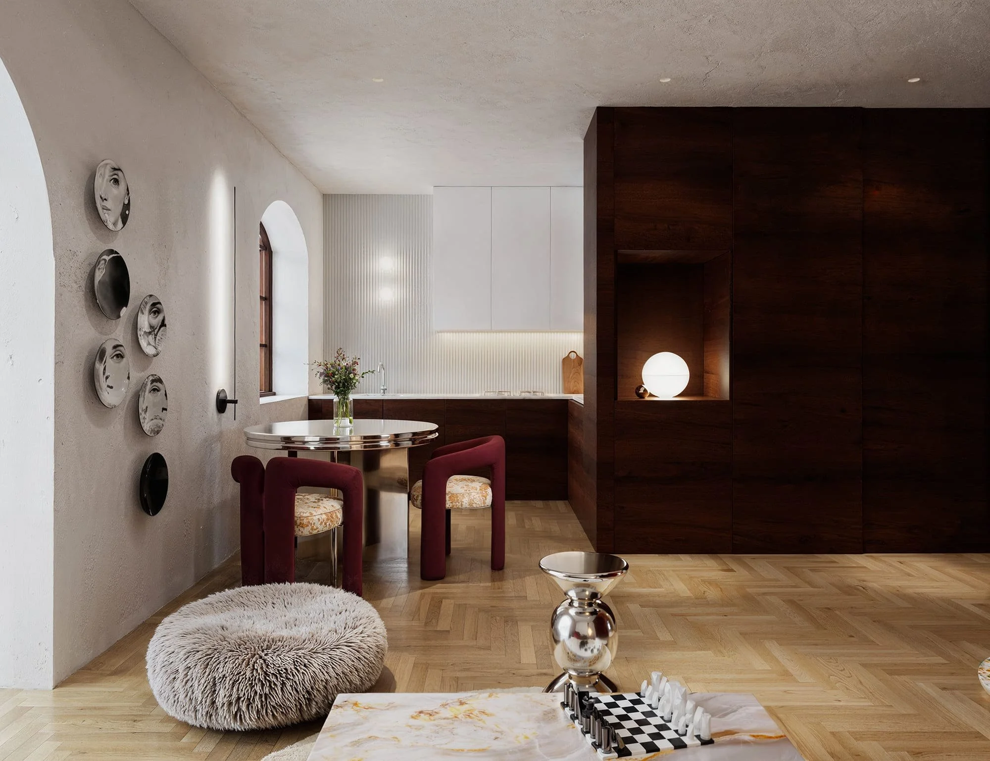 The project explores the art of defining space within a compact layout, using color, bespoke carpentry, and tactile materials to balance function and design.